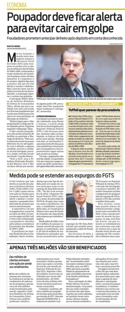 Em entrevista ao Jornal O Dia, tive a oportunidade de explicar um pouco mais sobre o acordo entre poupadores, bancos e Advocacia Geral da União (AGU) para recuperar as perdas com os planos econômicos das décadas de 1980 e 1990.
